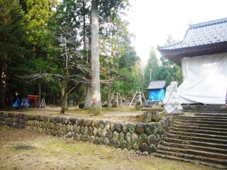 鳥居をくぐり長くつづく苔むした参道を通り抜けると、明るく開けた目の前に土俵が奉納された広場がみえてくる。 一段あがって拝殿本殿があるのだが、そのどの社殿も、そして大事に狛犬さえもしっかりとシートにくるまれてあり、この赤尾地区住民の神様を慕う気持ちの強さが如実に表れて物語っているように感じた。 神社の造りも、平泉寺白山神社の境内の雰囲気にどことなく似ていて厳かである。