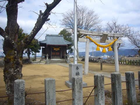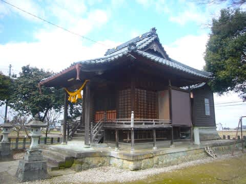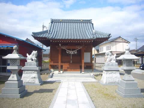 九頭竜川の南堤防側、福井バイパス8号線西沿いの地区。8号線を背にして集落端に鎮座している。境内のすぐ横にはボーリング場の施設が壁のように隣接。