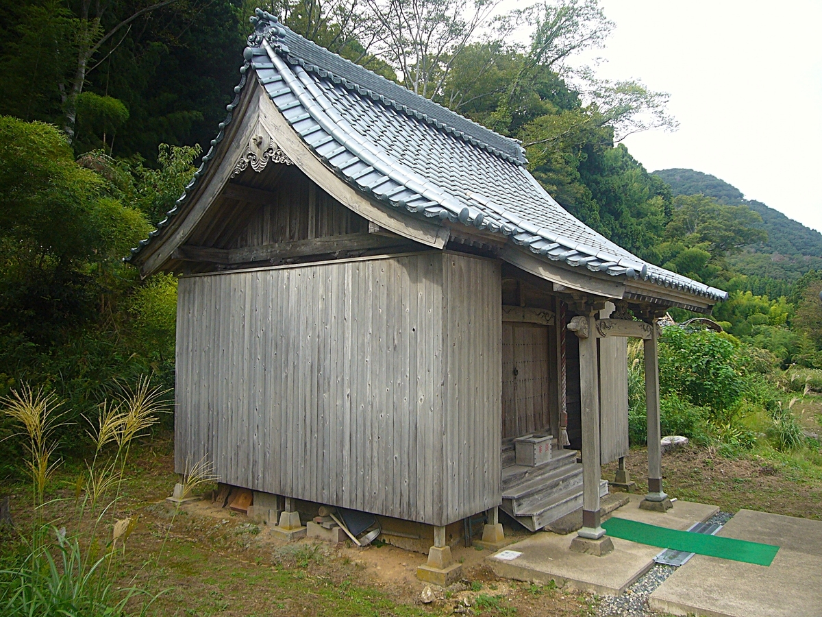 八幡町から県道3号線を900m南下。西の高須山(438m)に広がるゴルフ場方向へ右折し山の道路を5km進む。ゴルフ場横を進みそのまま山越えをして下り、分かれ道を左折して左の坂道を登っていくと高須山の中腹に広がる高須町へ到着。そのまま集落奥へと続く坂道を道なりに上り切って右折すると道沿いに神社が鎮座する。