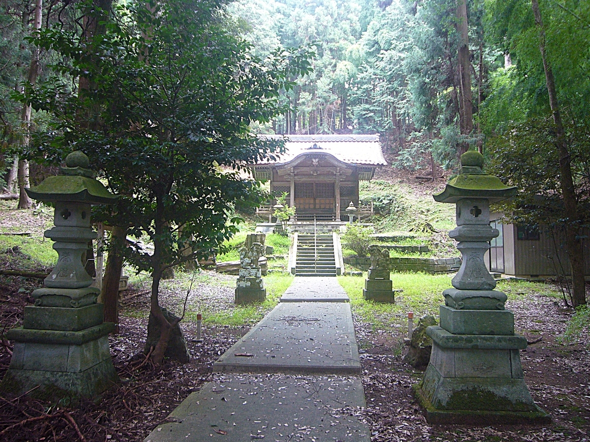 県道3号線を更に500m南下すると、県道155号と繋がる三差路角にある八幡町ふれあい会館裏の森の中に神社は鎮座する。